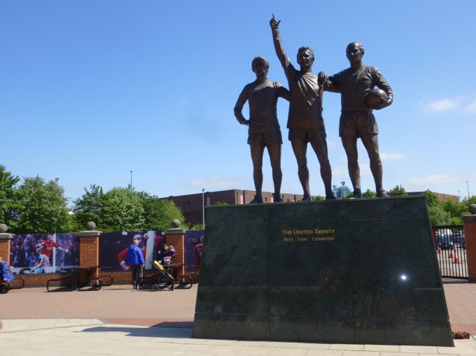 На главния вход има издигнати няколко паметника. Първият е на тримата големи, така наречената Света Троица на Манчестър Юнайтед: Джордж Бест, Денис Лоу и Сър Боби Чарлтън. Въпреки, че на рекламния плакат по-горе те са на фона на стадиона, в реалността всъшност стоят срещу него, ето така: