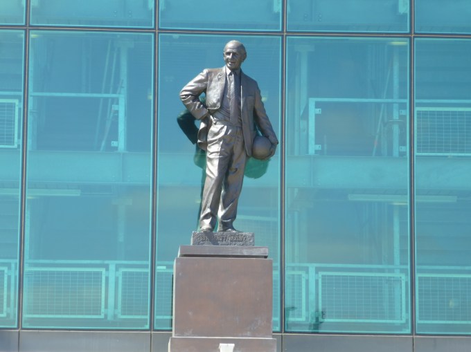 С гръб към стадиона, срещу тях, е легендарният треньор Сър Мат Бъзби. Ето близки снимки и на двете статуи:
