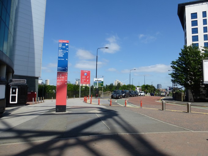 От защрихованото на схемата място към Южната трибуна South Stand, наречена на Сър Боби Чарлтън се вижда постепенно по часовниковата стрелка ето така: