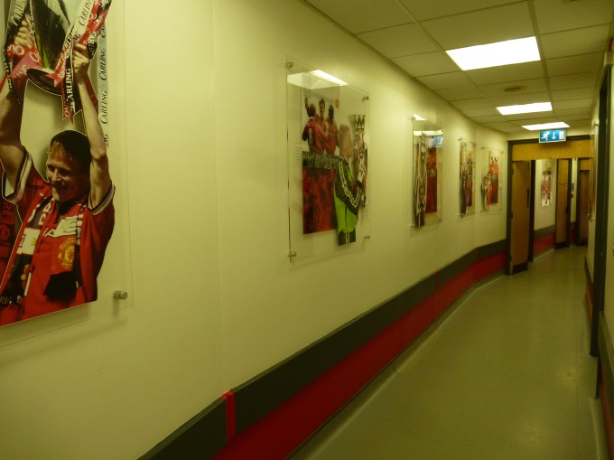 По стените на коридора са сложени големи стъклени плаки за всяко първенство, което Манчестър е печелил. Подкачих Греъм, че няма много останало място по тия стени, той въодушевен ми отговори, че ще направят място, само да има титли.