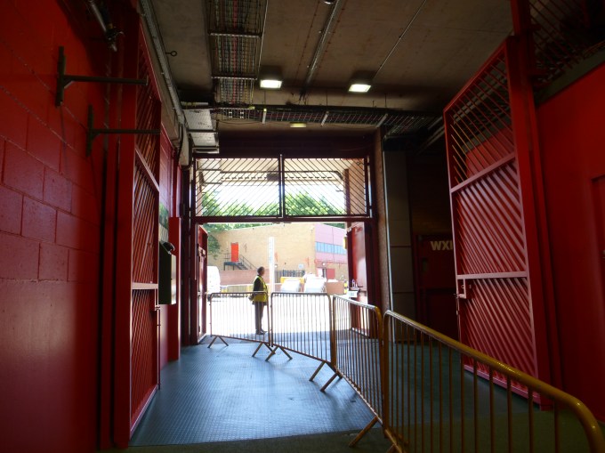 Отново тръгваме да обикаляме по тунелчета и коридорчета, Греъм се поотпусна и говори повече без да го питаме. Изведнъж излизаме на мястото, където спират рейсовете на отборите – тунела. Той се вижда като самостоятелна дъга на схемата по-горе точно между South Stand и East Stand. Ето го на снимка: