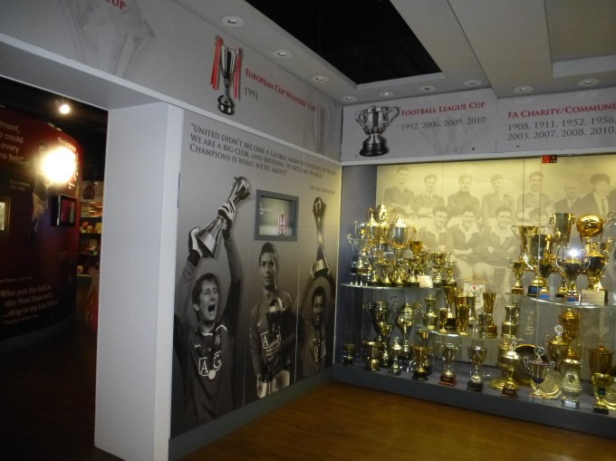 Разделихме се с Греъм и за нас остана да видим самостоятелно музея и Червеното кафе, които се намират под Северния Сектор Сър Алекс. Не съм си представяла, че може да има толкова купи и трофеи на едно място. Музеят е чудесен, има всичко, за което може да мечтае един почитател, ще ви сложа повечко снимки, за да му се насладите. Спокойно може да се прекара цял ден на това място, ако сте истински фен и ви интересува написаното по стендовете и искате да видите всички видеа и меморабилия. Има безброй монитори, които показват мачове, велики моменти, велики играчи, можете да си изберете на някои места какво да гледате и какво да слушате. Има фанелки и всякакви сувенири от един до хиляди паунди, ако желаете да си закупите нещо от музея или магазина към него.