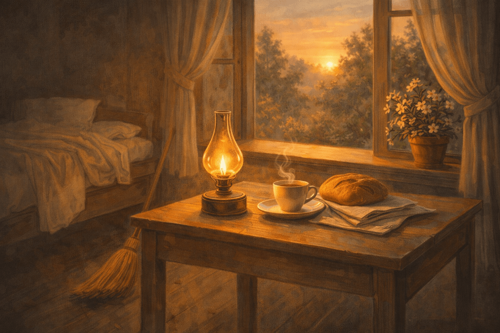 И тогава затворила прозореца откъм вятъра, внесла прането, напълнила делвите с вода, помела пода, избърсала масата, нахранила детето, сложила хляб в кърпа и оставила лампа до вратата.